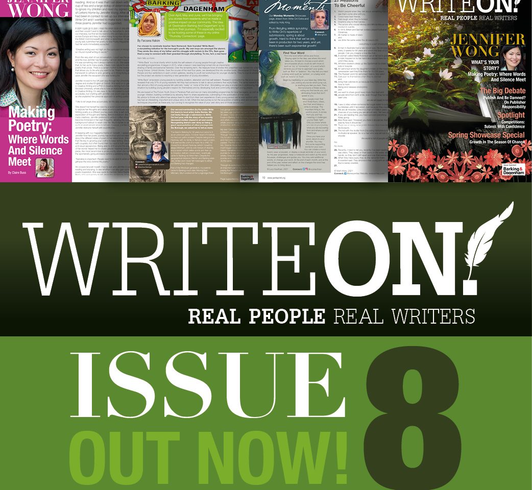 Write On! 8 is out today (see digital version here). April is a double header for Write On! – the publication that connects emerging and established writers to each other and the publishing industry. Two years ago in April 2019, Arts Council England Library NPO (National Portfolio Organisation) and London Borough of Barking and Dagenham (LBBD) supported Pen to Print, started work on its first print magazine and, this time last year Write On! Extra was born online posts sharing experience, strength and hope for unprecedented times.